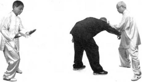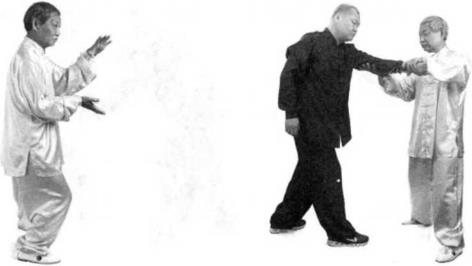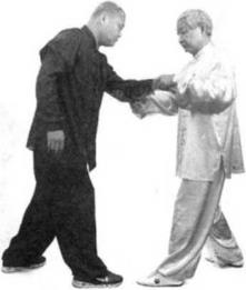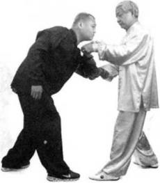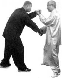 当我卷掌反斩对方的腰眼之时对方含胸后坐想躲过我的招式。我即扬起左僻用反掌拍击他的左脸颊,如他头向右闪,我左臂即向内环绕一圈以我左肘压住他的右肘,以掌背向他面部拍击。如他头向后仰乂未被我击中我即落左臂压他的右肘,使他无法转身用左手向我还击然后我即沉裆出步,用我的左膝顶住他的右膝委中穴。当我出步的时刻,对方即转腰用左宜拳向我的胸部斜击,我随即用左手叼住他的左腕。
