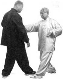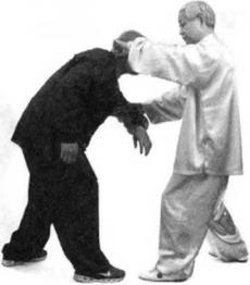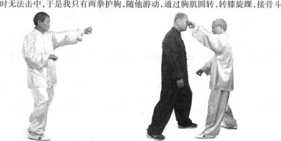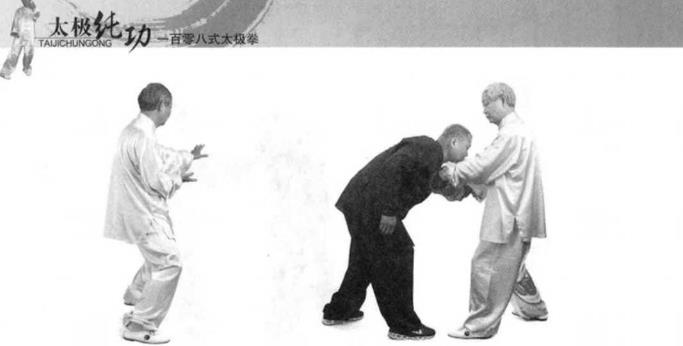 我左手叼住他的左腕由内向外卷曲并用我的右手封住他的肘部我腰向左转右掌前推左手内搬来撅掀他的肘部使他左臂疼痛无法脱身。然后我继续上托他的左肘,牵他右转,和我面面相对,我即旋转左臂用左拳打他的颈后风府穴或翳风穴右臂旋转用右拳击打他的小腹或腰眼。