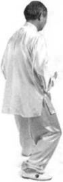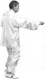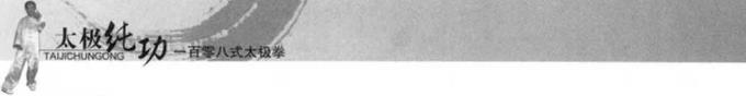 腰向右转,版心向左腿转移,左臂顺时针旋转左掌从下向上,朝额头前方弧行旋转,当掌离正面约一尺距离时再以掌变拳拳背向内虎口朝下(图395)(图395。紧接着腰向左转,右掌逆时针旋转,从右向腹膈前弧行移动并以掌变拳拳背向内,虎口朝下至左拳向下垂直线约一拳距离止。(图396)(图