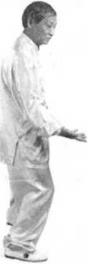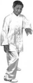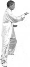 接着重心左腿坐实腰向左转,身体转向偏左方右脚尖向里回扣45度右掌向左移至左膝上方右脚尖点地脚跟朝外摆重心不变,腰微右转,而向南方右脚尖点地,脚跟朝里回收右腿提膝朝右肩峰所指方向迈开一步。右掌同时直线上升到胸部前方,手心朝上。(图407图407)