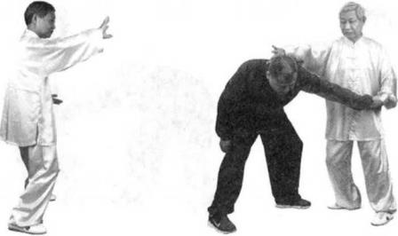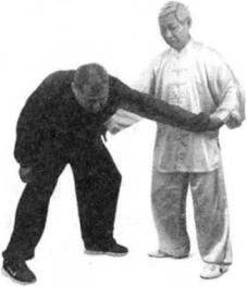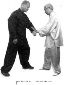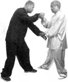 我身后乂来一人,用左宜拳向我的右胁击来我急忙平掌后坐将右臂落卜二巾先护住我的右胁接着我即用左手抓住对方的左手背向内缠卷并向我左方拖拉当他被我牵动之后,我即旋卷右掌反斩对方的腰眼