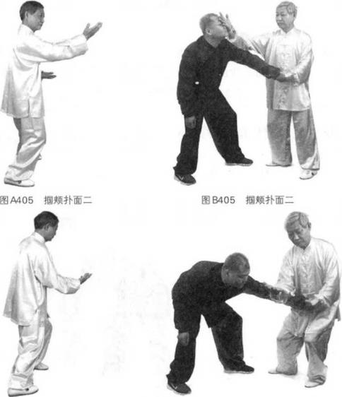 当我卷掌反斩对方的腰眼之时对方含胸后坐想躲过我的招式。此时我即扬起右臂用反掌拍击他的脸颊如他头向左闪,我右臂即向内环绕一圈以我右时压住他的左肘以掌背向他面部拍击。如他头向后仰乂未被我击中,我即落右臂压他的左肘,使他无法转身用右手向我还击然后我沉裆出步用我的右膝顶住他的左膝委中穴。当我出步时对方即转腰用布直拳向我的胸部斜击我随即用右手叼住他的右腕。