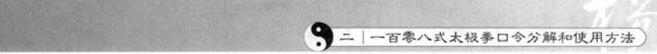 身向后坐,重心移向左腿。右肘坠肘回收至腰际,右学也随之从上到卜从外向里弧行移动向左掌靠拢右肘距左掌约一拳手心朝上左手中指对着右小臂中部。(图406)(图406)