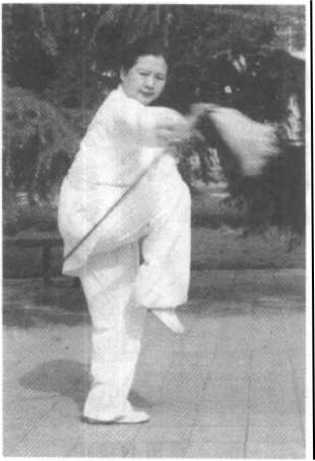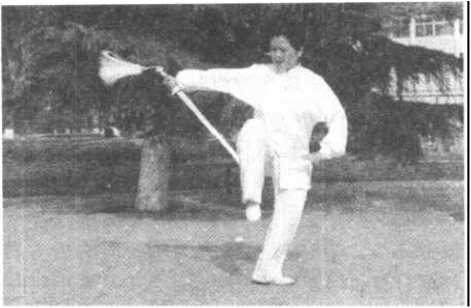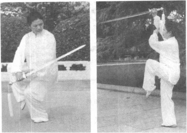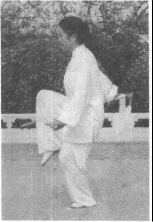 (2)独立架剑时右腿直立,立身中正。身体面西微偏北,左 膝尽量上提并朝正前方(西),左脚尖下垂,脚面展平,小腿和 脚掌微向里扣护档(后面再有提膝独立,方法雷同者不再赘述)。