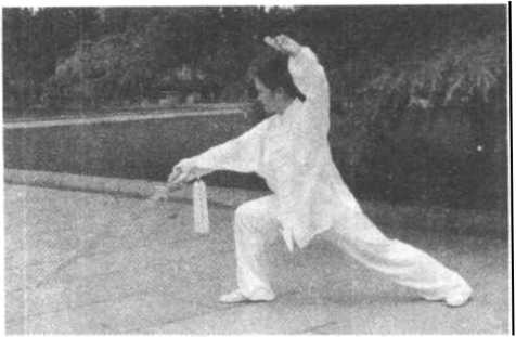 (2) 第二动是顺弓步低刺 剑,剑尖离地约15厘米,剑尖 不得触地,落脚时速度要匀,迈 步要稳,左剑指臂要撑圆,但勿 起僵劲。
