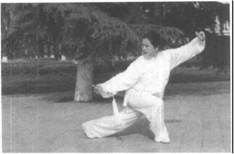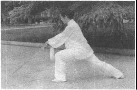 (3)踏实左腿,左脚屈膝,重心前移成左弓步;右手持剑向 前下方立剑刺出;左剑指经前上划弧回落附右腕内侧,手心朝 下;眼看剑尖;力达剑尖,方向正西(如图56)。