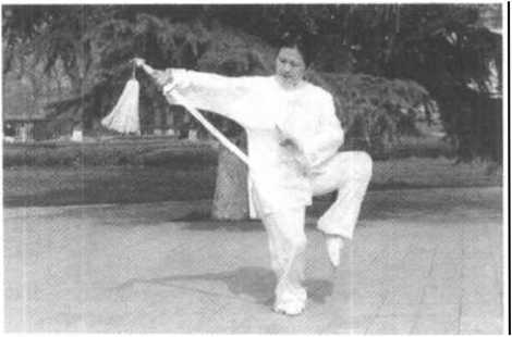 (1)上体微右转再左转,使身体面北,右腿独立微屈膝,左 腿提起脚尖虚悬,收至右踝内侧;右手持剑松腕,臂内旋划弧绕环, 使剑尖由前渐向下、向里、向左立圆划弧调头,绕至体右胯侧前下 ?44.