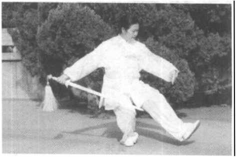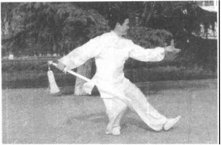 方,剑尖转朝左,腕略与肩平;左剑指臂渐外旋,向右划弧落于右胸 下,使手心朝下,指尖朝右;眼随剑走(如图53,反面)。方,剑尖转朝左,腕略与肩平;左剑指臂渐外旋,向右划弧落于右胸 下,使手心朝下,指尖朝右;眼随剑走(如图53,反面)。