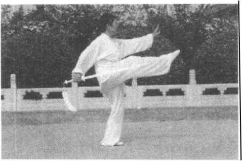 (2) 举腿藏剑时注意坐腕前指与伸摆腿、藏剑均要同时到位, 剑指划弧要舒展圆活,指背朝前上撩出,再坐腕,并要注意坠肘。