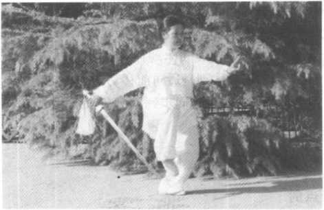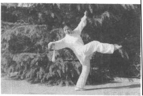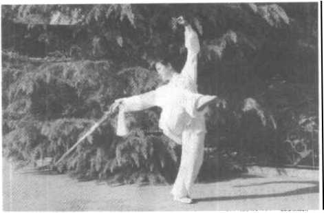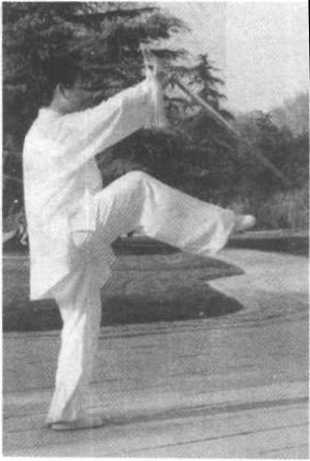 (2) 举腿翻剑时,右臂要先微内旋前伸、上提,再翻腕翻 剑。点剑时右臂要先绕至体右侧后方沉腕微落,再向前伸送,提 腕点剑。