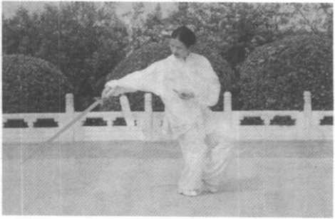 左脚向前跟半步至右脚内侧,脚尖着地成左丁虚步,脚跟微内扣, 使脚尖朝北偏西,与右脚略呈外八字;右手持剑随重心前移,向前 下方立剑刺出,臂与剑成一直线,方向正东;左剑指划弧微落回收 至右胸下,手心朝下,指尖朝右;此时身体面北,头微右转;眼看 剑尖;力达剑尖(如图135,反面)。