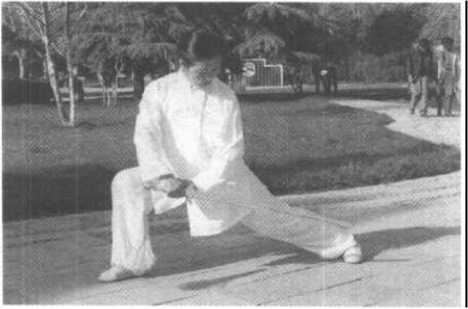 指要在退步、坐盘过程中完成;同时注意重心后移时上体要微前 倾,要掌握好身体平衡。上述四点是坐盘平衡的要领,望习者悉 心研习,可得其中三味。本式动作难度较大,如有困难也可将坐 盘动作改为竭步,即左脚向右后插步,使两腿交叉,屈膝半蹲成 竭步,其余不变。