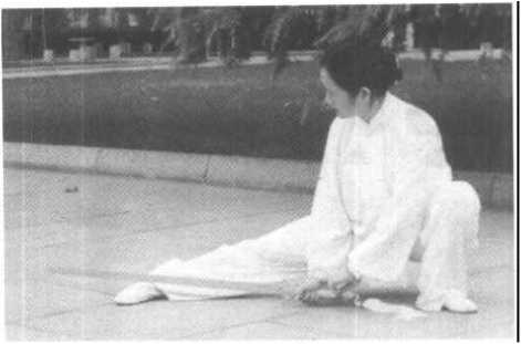 (2) 左腿屈膝全蹲,身体继续下沉,踏实右脚跟,左脚跟外 碾,右转体,右腿贴近地面成仆步;右手持剑使剑横置划弧下落 经胸前,再旋臂翻腕下落,使手心朝外,置于裆前,立剑,随转 体贴近右腿内侧地面,随重心前移右脚尖外摆向前穿剑,方向正