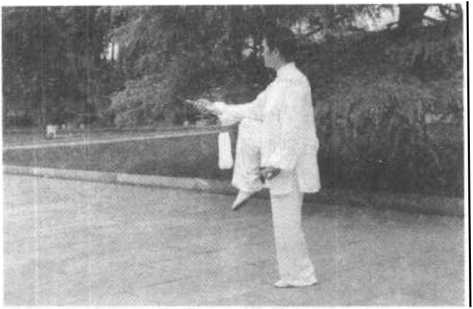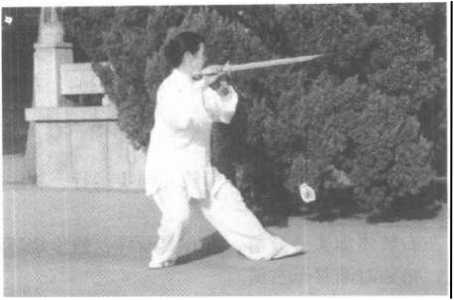 (2) 抱剑时两臂要撑圆,不要贴身夹肘,注意浣肩坠肘,并 与左转体协调。抱剑是过渡势。