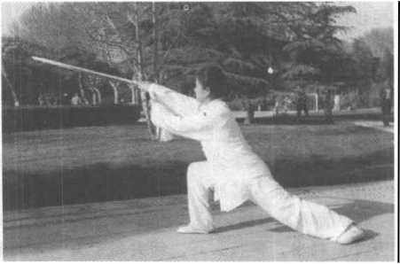 剑刺出,剑尖高与喉平,方向朝西偏北约45°;左剑指划弧下落 至左胯侧前,手心朝下,指尖朝前;眼看剑尖;力达剑尖(如图 209 )o