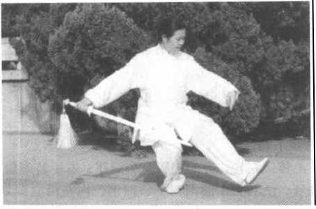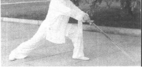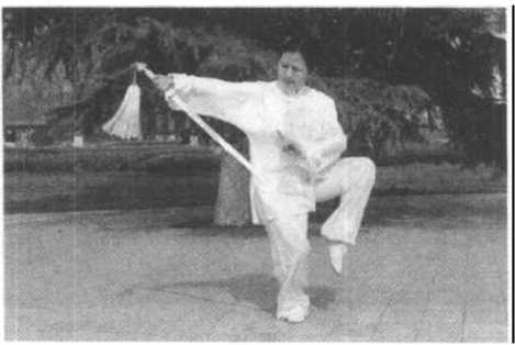 (1) 本式是弓步低剌剑,剑尖离地约15厘米,剑尖不得触
