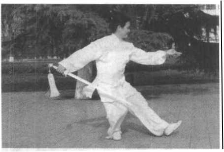 (3) 四肢要随身体转动,左脚落脚与落剑撩剑指、弓步与刺 剑要同步。