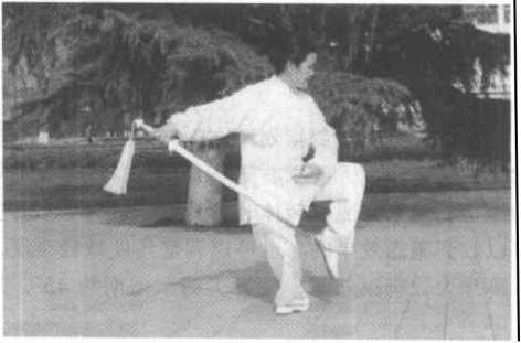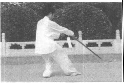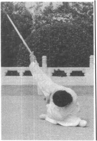 (1) 右脚后撤比回抽托举 要稍晚半拍启动,当剑快到头 前上方时右脚才离地。坐盘下 扫剑要松肩并柔腰松胯转动才 灵,扫剑要由腰带转。