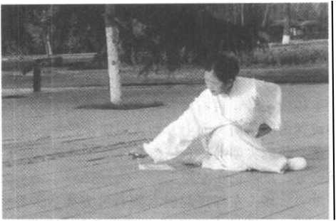 (2) 重心后移,左脚提起向右脚右后方插步,身体右后转, 双腿屈膝全蹲,使两腿交叉叠扰下坐,臀部和左腿及脚面均着 地,右大腿靠近胸部,脚面展平贴地,屈膝盘腿;右手持剑旋臂 随身体下降向下划弧下落,使手心朝下,在体前贴地面,由左向 右平扫剑;左剑指划弧下落,旋臂经左腰侧向后、向上绕环;眼 随剑走;力达剑身(如图227,图228)o
