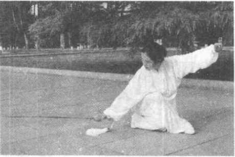 (5) 点剑要与劈剑联结成一个整体,劈到即点,点到即走。 点剑时腰向右拧,左肩向里合,整个势子要周身放松,转动才能 灵活。式与式之间衔接要连贯,劲力要完整并一气呵成。