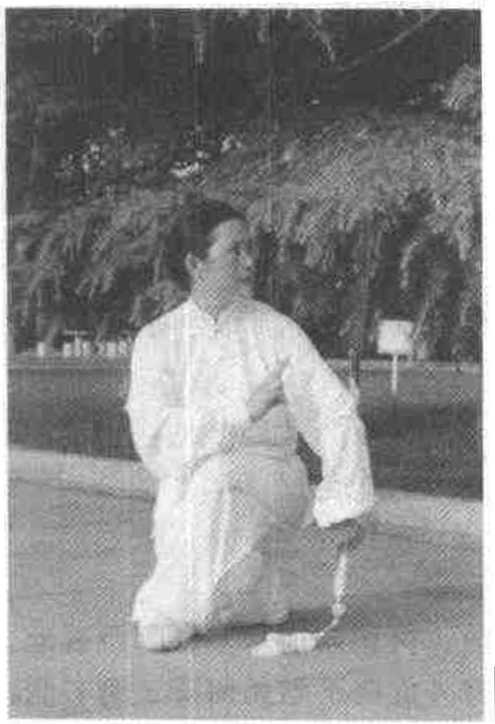 (2) 转竭步时,身体重心要边移边降不要停顿。对竭步的要 求楚:两腿交叉屈膝全蹲,前脚全脚着地,脚尖外展,后脚跟离 地,臀部坐于小腿上,接近脚跟。竭步时要松腰竖脊,保持身体 中正,不要弓腰驼背。