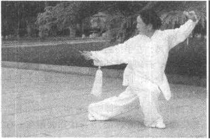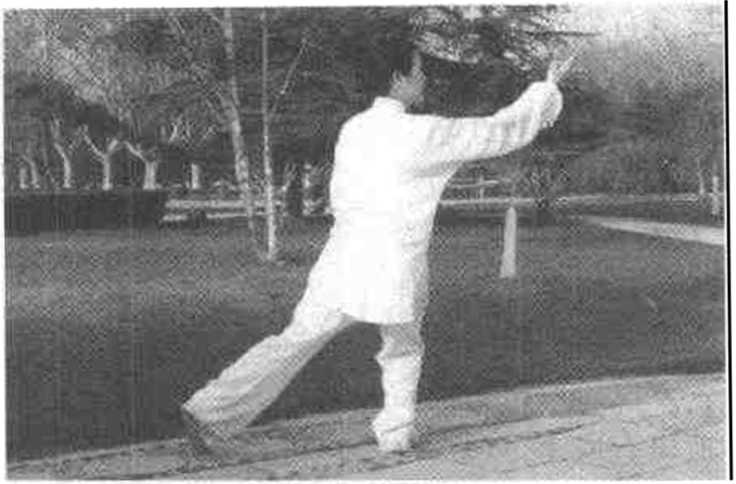 (2)重心前移,左脚向前上步,前脚尖着地膝微屈,身体右