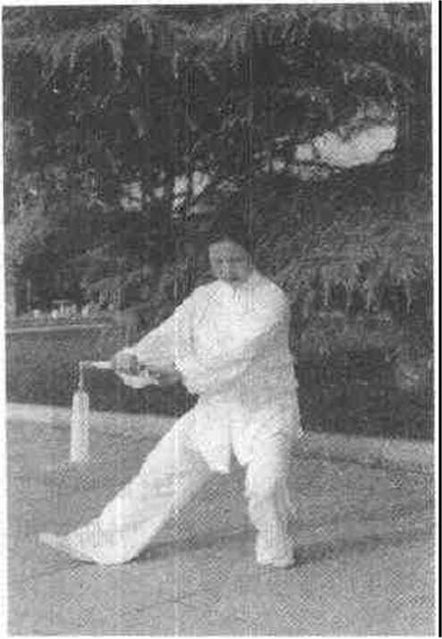 图10图9后转动约135°,左脚跟外展, 重心仍在右脚上;左手持剑经 前上方(正西)随转体向右后 上方划弧绕环摆举,使剑柄朝 东,落至胸前,手心斜朝下; 右剑指随转体臂渐外旋,向后 划弧上举至肩侧右前方(正 东),腕略比肩高,手心斜朝 内、朝上;眼随剑走,后转体 时转视前方(正东)(如图 9)〇