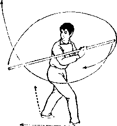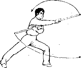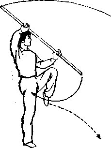 ①右脚微向后撤,两腿微屈。右手 握棍,右臂微屈,使棍前端向右后划 弧;左臂屈肘,左掌立于右前臂内俩。 头向右转。目视棍后端。②右脚向后撤步,左腿屈膝提 起。同时,左手与右手成对把握棍, 使棍后端向上向前下划孤,使棍前嫌 向下向后上划弧,最后使棍后上前下 斜举托于体前。目视前方。第二五势泰山压顶左脚向前落地成左弓步,右手握 棍向前盖打,左手握棍置于右腋下, 棍前端稍高于头部。目视棍前端。