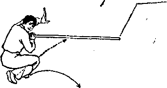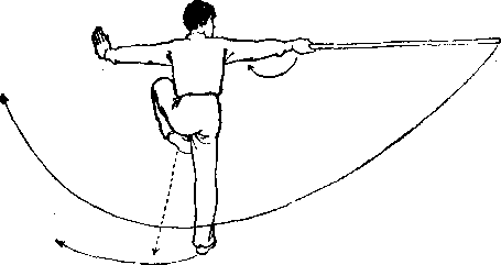 ① 右脚后撤一步,体向右转,右 腿屈膝成右侧弓步。右手握棍,右臂 屈肘上提,右手心向上,使棍身横于 头前上方;左手离棍变掌,左臂向左 侧平举,用小臂托住棍中段,左立掌 掌心向左前。目视左方。② 左脚向右收移,体向右后转 度,两腿屈膝向下成歇步。同时, 右手握棍保持方向不变,只是随屈膝 下蹲右臂屈肘向下,右手心向后停于 左腋前;左臂屈肘,左手摩掌架于额 前上方,拇指向下。目视棍前端。*n③ 身体起立,右脚向右跳落,右 腿伸直,左腿屈膝提起。同时,右手 握棍向右侧平推点击,右臂侧平举; 左掌向左侧摆成立掌,掌心向左前 方,左臂侧平举。目视右方。