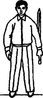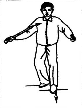 (2)身体左转,身体重心再移到左腿,右脚向前跟进半步,与左:::: 脚成开立步(与肩同宽,脚尖向前);同时,左手接剑(反握),经体前 二:: 下落垂于身体左侧;右手变成剑指向下、向右后方划弧上举,再向前、…?- 向下落于身体右侧;全身放松;眼平看着前方。(图61) ::::