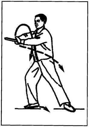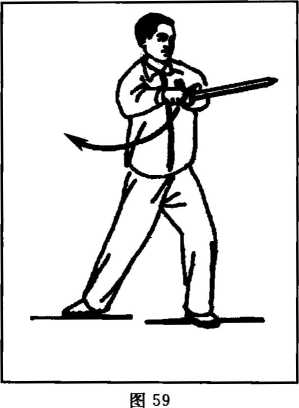 收势 (D身体重心后移,随即身体向右转;同时,右手剑向右后 方回抽,手心仍向内;左手也随即屈肘回收(两手心内外相对)。(图60)