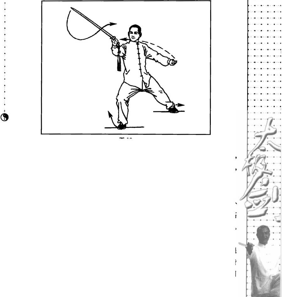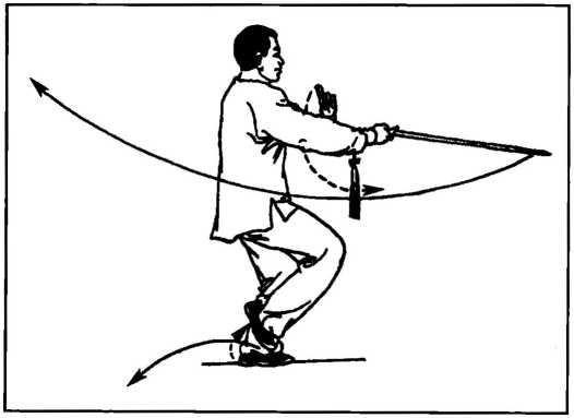 (1)身体重心移至左腿,右脚跟提起;同时右手握剑、沉腕、变手.