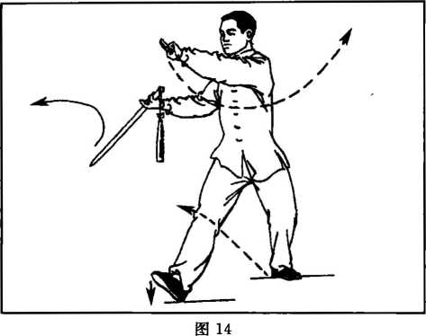 (D左腿屈膝,身体重心后移,上体随之略向右转,右脚尖翘起外 撒;同时右手握剑屈肘向右、向后划弧至体右后方,手心朝上,腕略高 于腰;左手剑指向前、向右划弧摆至右肩前,手心斜朝下;目视剑尖。 (图 14)