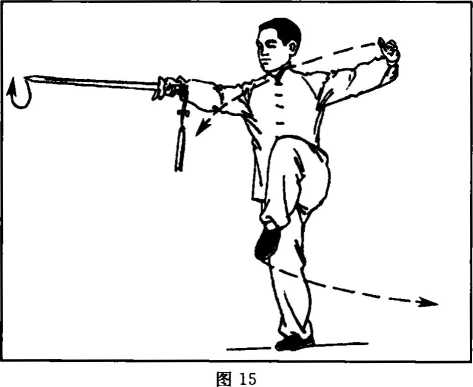 (2)身体略向左转,重心前移,右脚掌踏实,右腿自然直立;左腿 屈膝提起成右独立步;同时右手握剑向前劈出,剑、臂平直;左手剑指 朝下向左划弧摆举至与肩平,手心朝外,指尖朝前;目视剑尖。(图 15)