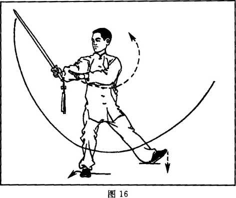 (1)右腿屈膝半蹲,上体略左转,左脚向左落步,脚跟着地;同时 右手握剑以腕关节为轴翻腕使剑尖在体前顺时针划一圆弧;左手剑指手 心朝下附于右小臂内侧;目视剑尖方向。(图16)