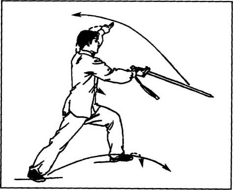 要点:身体转动与剑绕环要协调一致。弓步时上体不可前俯,亦不 可后仰,保持竖直。