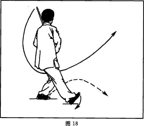 (1)右腿屈膝,重心移至右腿上,左脚尖翘起并稍外展,上体左 转;继而,随重心前移左脚落地踏实,上体略右转,右脚向右前方上 步,脚跟着地;同时右手握剑随转体屈肘向上、向左划弧至左胯旁,手 心朝里,剑尖斜朝后上方;左手剑指下落附于右腕部手心向下,目视剑 尖方向。(图18)