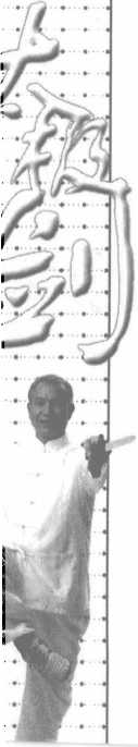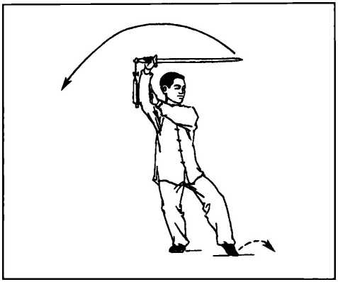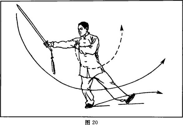 (1)身体先向右转,左脚向左上步,脚跟着地;同时右手握剑向 上环绕、向右划弧至身体右上方,腕稍低于肩,臂微屈,剑尖朝右上 方;左手剑指随剑绕行屈肘落于右肩前,手心斜朝下;目视前方。 (图 20)
