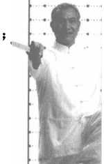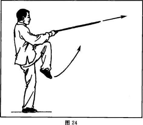 (3)左脚向前活步,重心前移,左脚着地站稳,左腿自然直立,右 腿屈膝提起脚尖向下成左独立步;同时两手手心翻转朝上随提膝由两侧 向胸前相合,左手剑指捧托在右手背下,与胸同高;剑尖朝前,略高于 腕;目视剑尖。(图24)