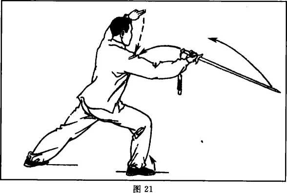 (2)身体左转,重心移至左腿,左脚尖外展落地踏实,继而右脚向 前上步,重心前移成右弓步;同时右手握剑经下向前立剑撩出,腕同肩 ,, 高,手心斜向上,剑尖斜向下;左手剑指向下、向左上方绕行划弧,臂 呈弧形举于左额上方,手上斜朝上;目视前方。(图21)