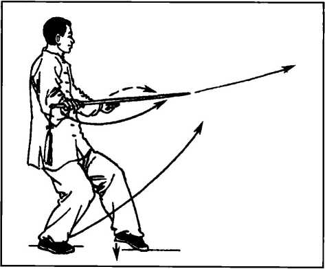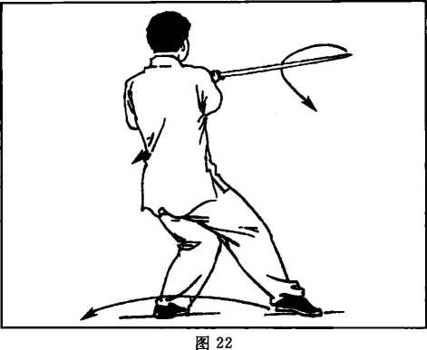 (1)左腿屈膝半蹲,重心后移,身体略向左转;同时右手握剑随转 体向左平带,手心朝上,腕同胸高,剑尖朝前;左手剑指屈肘下落附于 右腕处,手心朝下;目视剑尖方向。(图22)