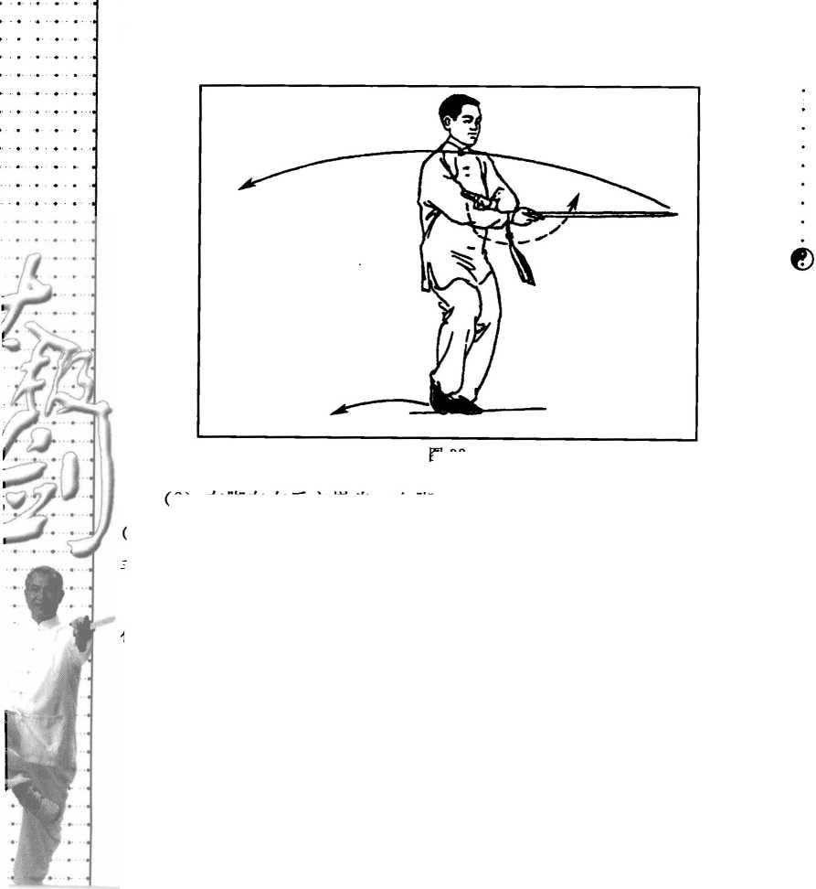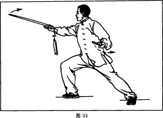 图32图32(2)右脚向右后方撤步,左脚随之碾地内扣成右横裆步,身体右转 (约90°);同时右手握剑向右平斩;左手剑指向左分展侧举,略低于胸, 手心朝左侧方,指尖朝前上方;目视剑尖。(图33)