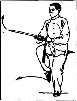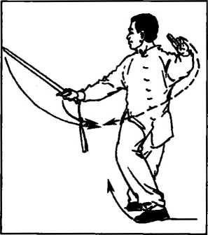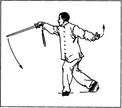 (1)重心前移,右脚虚收提于左脚内侧(脚不触地);同时右手平 握剑,沉腕,手心斜朝上;左手剑指屈肘向下附于右前臂上;目视剑 尖。(图32)