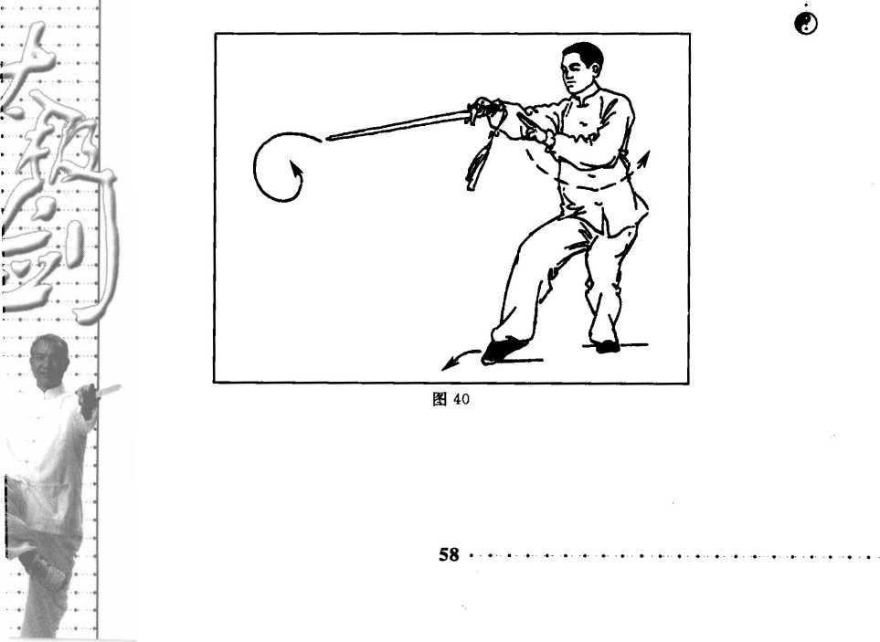 (2)右脚向前上步,重心前移;同时右手握剑,手腕发力绞剑; :左手剑指向下、向左划弧侧举,腕略高于肩,手心朝外,指尖朝前,臂 *呈弧形;目视剑尖方向。(图41)