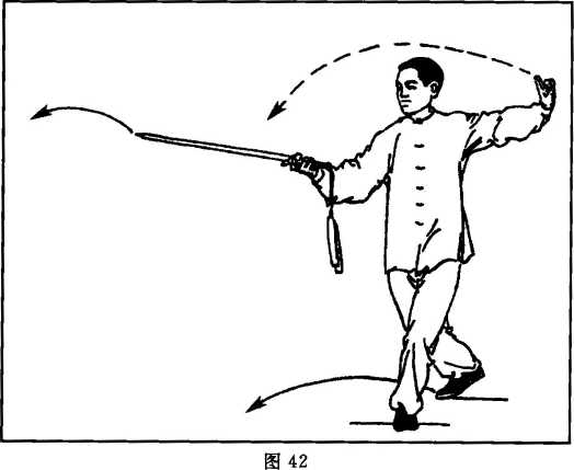 (3)左脚向前上步,重心前移;同时右手握剑再次绞剑;左手剑指 动作不变;目视剑尖。(图42)