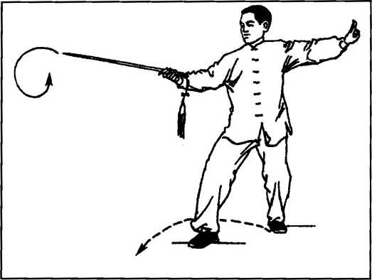 要点:上步时,步伐要轻灵平稳,不可忽高忽低。上一步,绞一 剑,共上三步,并使上步与绞剑协调一致,剑尖运转呈螺旋形。