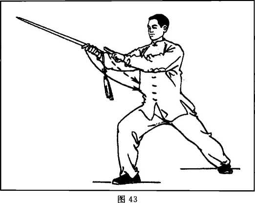 (4)右脚向前上步成右弓步;同时右手握剑继续绞剑后向前送;左 手剑指经上向前附于右小臂上,手心朝下;目视剑尖。(图43)