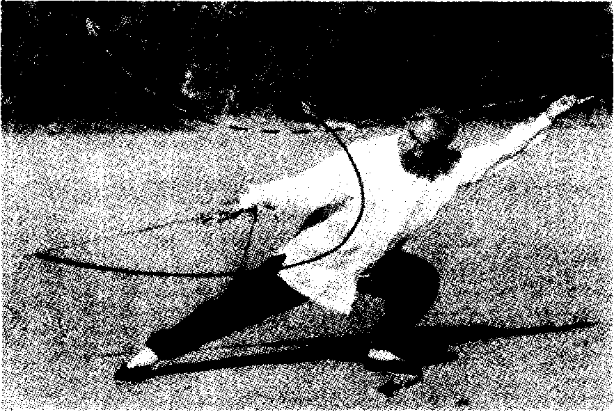 图四142姿势说明:右足向后撤一步,身向右转成仆步。同时,右手剑向 右下方砍出;剑下刃向后,上刃向前,剑锋向右偏下方;左 手剑指随伸臂,扬掌,指向左方。目视剑锋。(图四142)应用说明:敌自身后用剑刺我头部。我转身仆步避开敌剑,顺势 用剑砍敌之腿。