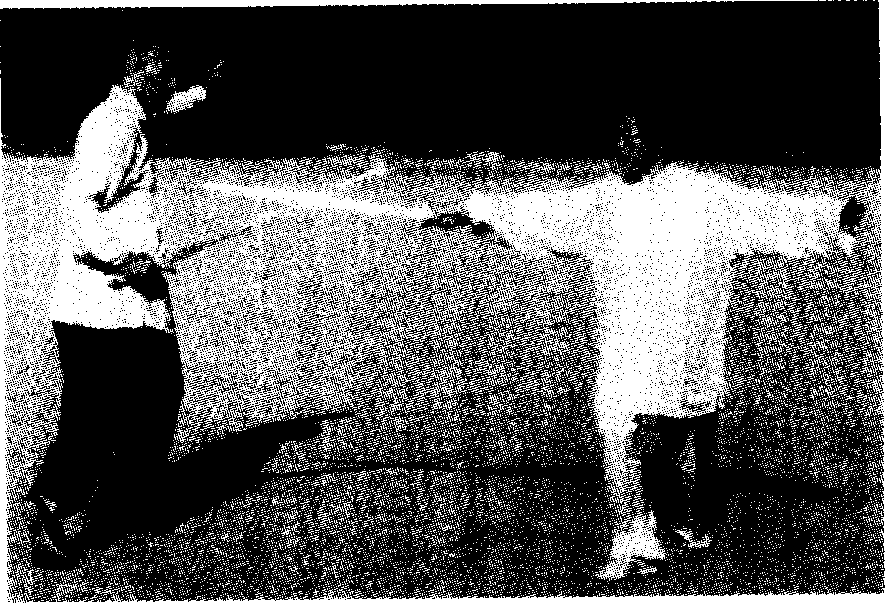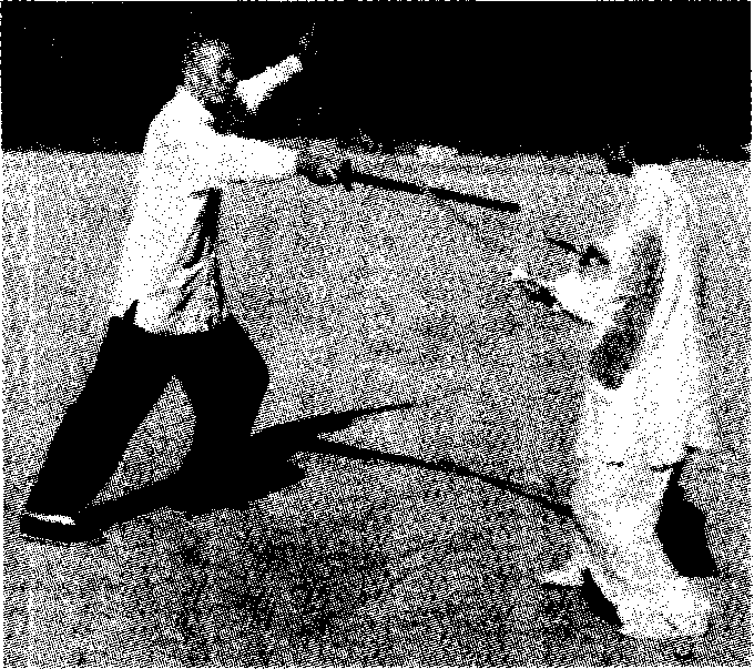 5. 右手剑伸 臂刺乙。乙左足向左侧进一步,弓左膝成左侧弓步;右手 剑粘住甲剑,向右侧引带,使之滑脱。(图五13)图五146. 乙右足进一步,弓膝成右弓步。右手剑伸臂刺甲。 甲右足进一步,身向右旋;右手剑粘住乙剑,向右侧回带, 使之落空。(图五14)图五157. 甲左足向左侧进一步,弓膝成左侧弓步。右手剑顺 势刺乙。乙左足进一步,身向右转,面对甲;右手剑向右侧 回带,使甲剑落空。(图五15)如此,循环,反复练习。