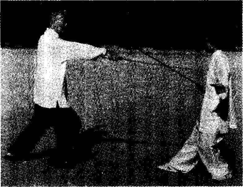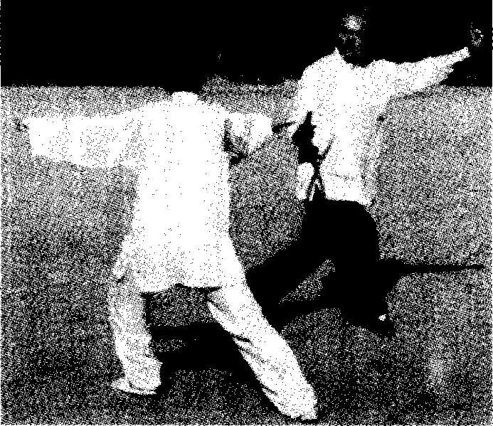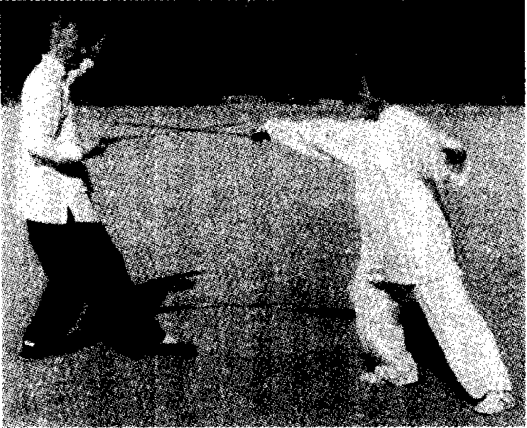 1. 甲乙对峙。右足在前,左足在后o右手持剑。甲弓 步伸臂平剑扎乙胸部。乙身向后坐,右手握剑,向外翻,反 手顺势用剑向右侧引带,使甲剑向右侧滑脱。(图五16)